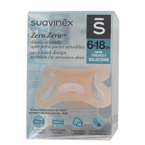 SUAVINEX CHUPETE SILICONA FISIOLOGICO SX PRO ZERO ZERO 6·18 MESES es apto para pieles sensibles. Está indicado para recién nacidos; su diseño aireado permite un menor contacto con la piel, reduciendo la posibilidad de irritación en la zona. Gracias a su textura, color y forma, minimizan la confusión con el pezón, respetando la correcta implantación de la lactancia materna durante los primeros días. Con forma simétrica, respeta la posición natural de la lengua durante la succión. Gracias a su cuello fino y a su cabeza plana, ayuda a respetar el desarrollo bucodental. Fabricado en silicona 100% de grado médico, es apto para pieles sensibles.